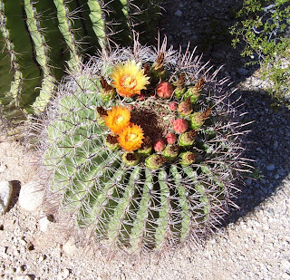 A quickie, before I forget. Most cacti bloom late spring (prickly pear) or early summer (sahuaros). For some reason barrel cacti bloom in the late summer. We have lots of barrels on our property, including the beautiful golden barrels, which I have never seen in flower.