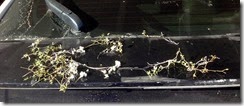 In the meantime, perhaps knowing that I am fascinated by nests, a pair of house finches has been spending the last two days trying to build a nest on the rear spoiler of my car. No matter how often I remove their nesting materials, they replace them. They are using mostly creosote and Texas ranger. Here is what it looked like this morning: